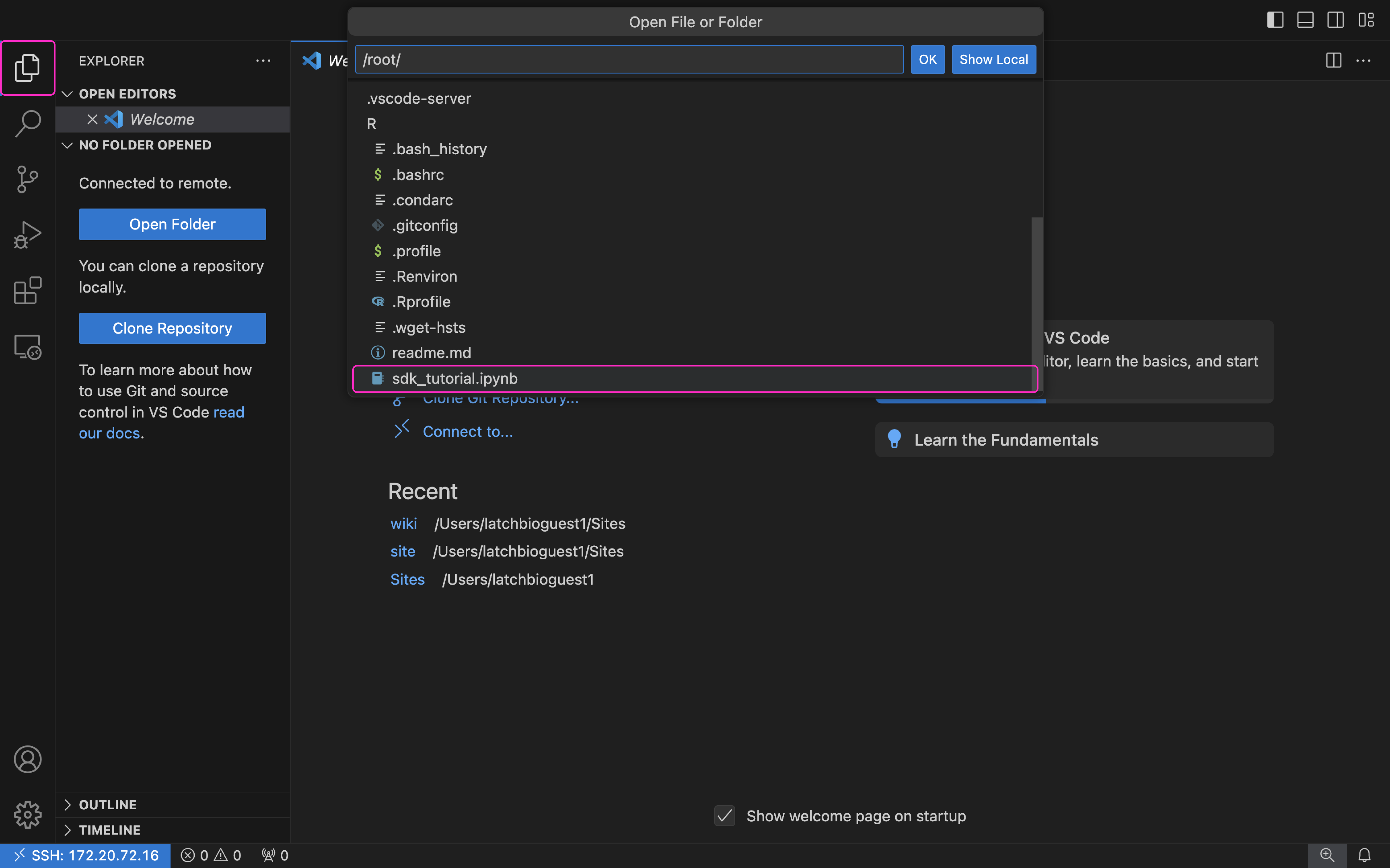 Click on the explorer tab, then click open folder and open sdk_tutorial.ipynb to test out