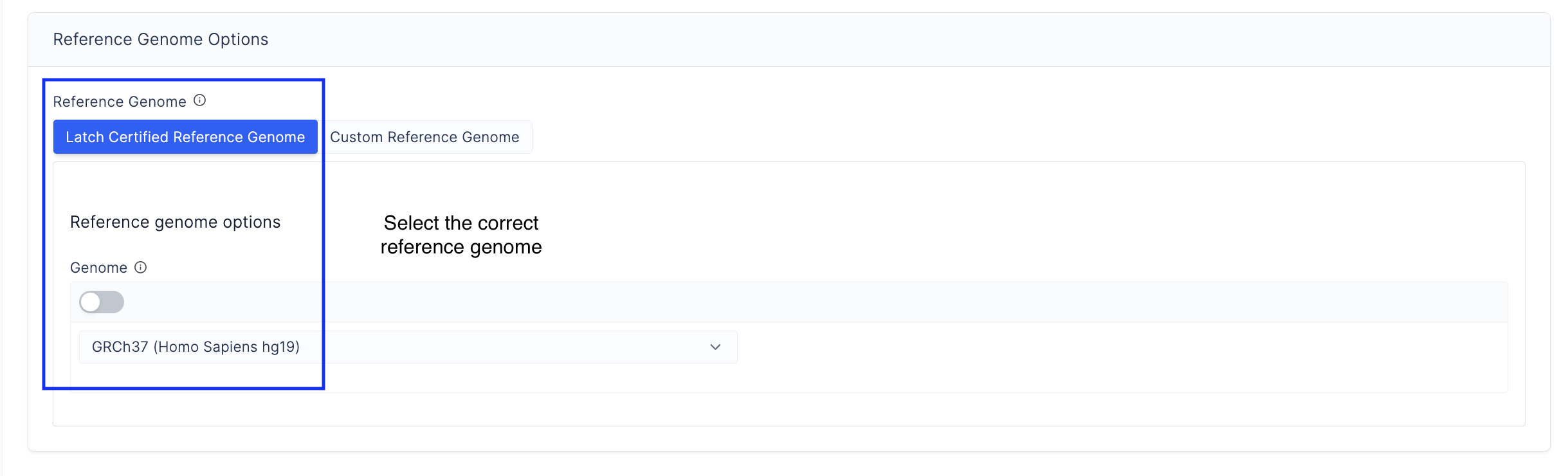 - Specify the reference genome. Choose from the latch-verified custom reference genome or input your own reference genome.