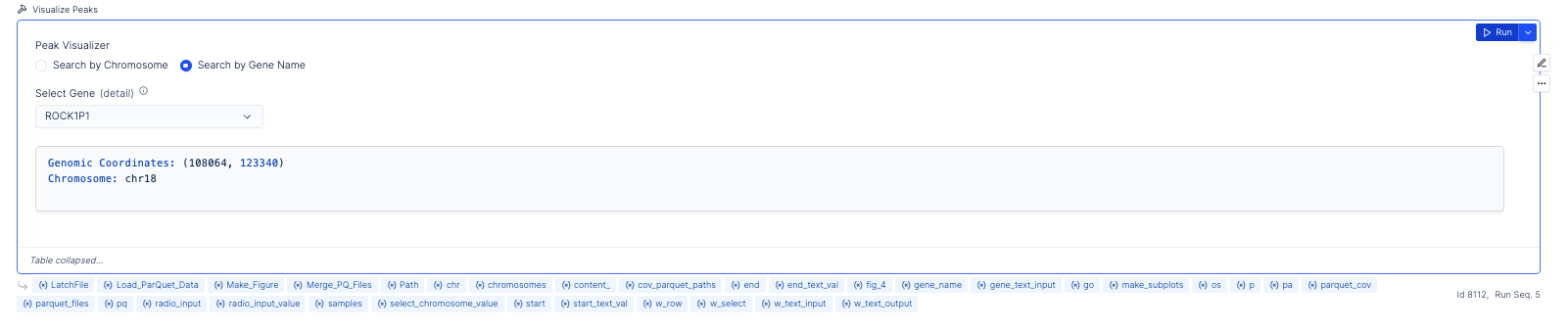 Further, the workflow creates a table in the registry with the run name within the project “ATAC_Seq_Results”. This table carries data tables computed as a part of the workflow that can be loaded with the verified ATAC Seq plots layout, which helps visualize the results from the workflow.
